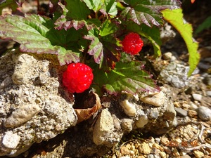 足元に目を向けると「山いちご」が真っ赤に色付いています。